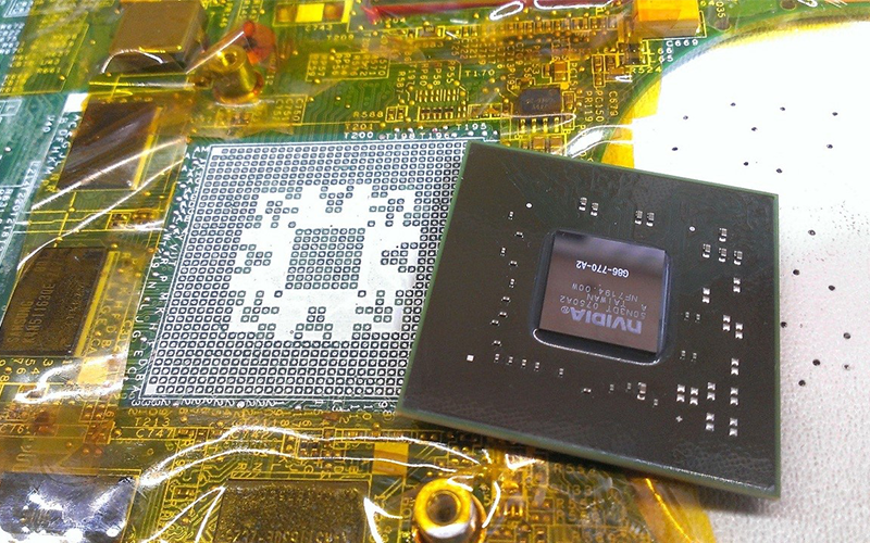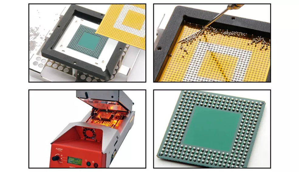 Já o Reballing é o procedimento indicado. Consiste em fazer a substituição das esferas com defeito padrão de PRATA por novas esferas com Liga de Estanho Chumbo.